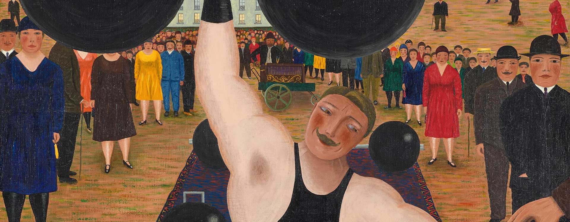 C’est jour de fête : le chapiteau est monté, le long tapis déroulé, la parade peut commencer. Autour de l’athlète forain qui donne son titre au tableau, le public, dans ses habits du dimanche, est symétriquement réparti. Parmi les costumes noirs, quelques robes de femmes font jouer les couleurs primaires : vermillon, jaune d’or, indigo. Corps pâle sur fond sombre, l’athlète est en majesté.