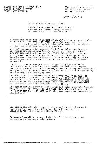 Cette exposition se propose de montrer un certain nombre de recherches et de réalisations menées en France et à l’étranger sur l’environnement sensoriel du petit enfant d’âge pré-scolaire, et de ses répercussions sur son développement.