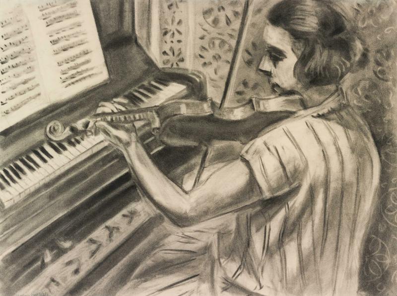 Une jeune violoniste devant un piano