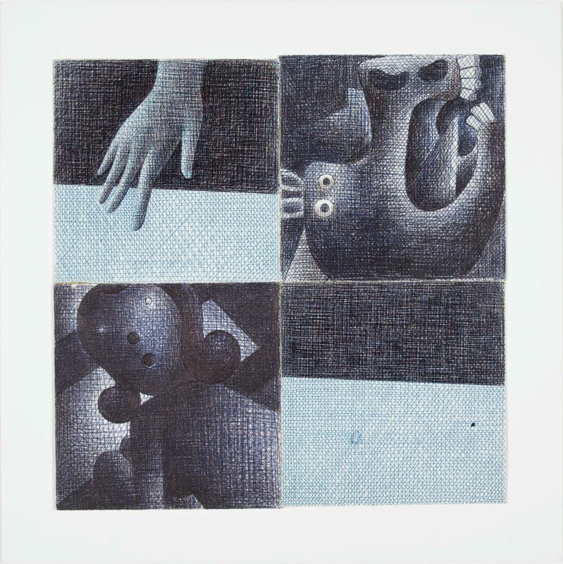 | Techniques | Assemblage de quatre dessins au stylo-bille sur carton |