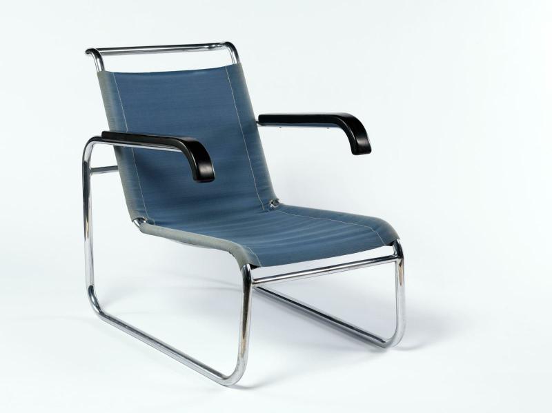 [B35 Armchair ], while retaining a stripped-back rectangular frame, offers greater amplitude and flexibility. Thanks to the armrests and inclined back, this piece is more ergonomic and favours the introduction of furniture using industrial materials into salons and living rooms. Breuer's furniture started to be mass produced as early as 1929 and still is today by the Thonet company, which originally specialised in the curved wood of bistro chairs.