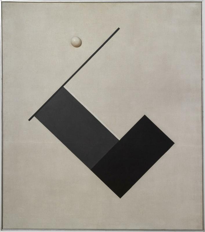 The wooden ball in relief on this painting introduces a third dimension, shifts the centre of gravity and upsets its balance.