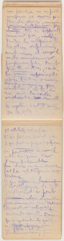| Is part of the set | Carnet dit "I SIC 1-14" Carnet (Indissociable set of artworks) Carnet relié, couverture en papier, dos toilé. Carnet comportant 74 feuillets dont 8 pages de dessins, 135 pages de notes et 5 pages de notes et dessins. La deuxième et la troisième de couverture comportent des notes. 2 feuillets manquants, une feuille avec notes insérée. 1916 | |