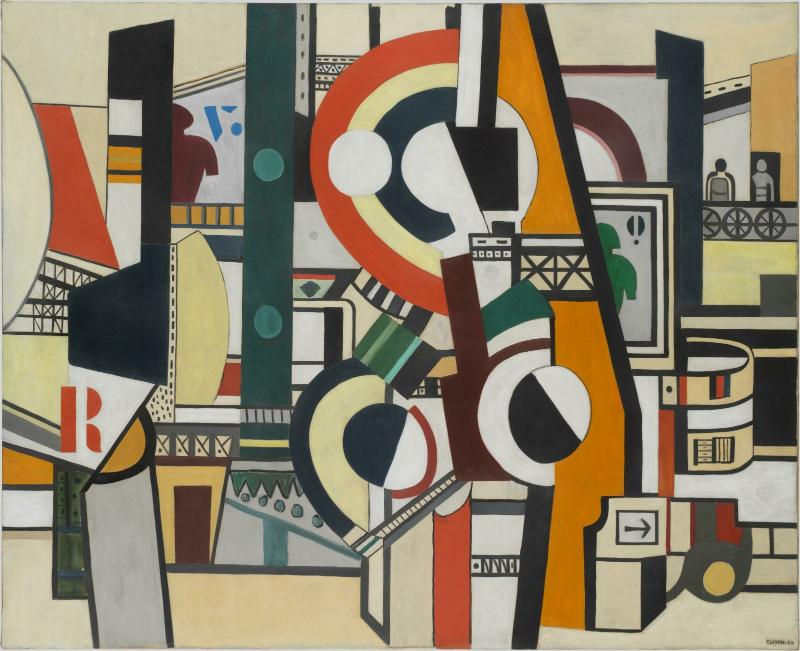 After his nerve-racking experience in the trenches, Fernand Léger could only marvel at the rhythms of the city. The visual ruptures presented by urban landscapes became pretexts for complex compositions. The stencilled letters of advertising posters are interwoven with geometrical forms inspired by railway signals and mechanical elements. Their dynamic organisation produces the effect of a machine-city. Here Léger develops the artistic vocabulary that would henceforth be his hallmark.