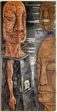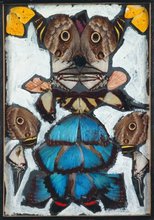 | Techniques | Assemblage de tessons de terre cuite, coquillages, raffia, fragments de miroir et de pommes de pin, grains de café, arête de poisson, sur contreplaqué, peinture | |