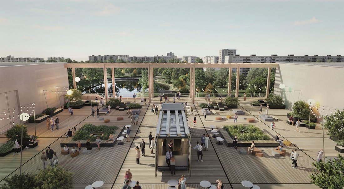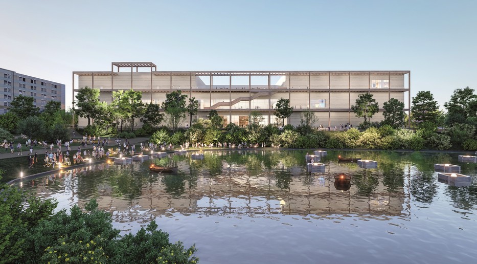 Al igual que el Centre Pompidou se abre a la ciudad a través de su Piazza, el Centre Pompidou Francilien se extiende hacia el parque Blanchette y su lago a través de un paseo arbolado. Su fachada, sus grandes pasarelas de madera, sus escalones plantados y su reflejo en el lago marcarán un nuevo diálogo entre naturaleza y cultura.