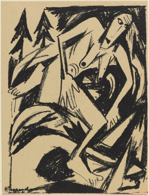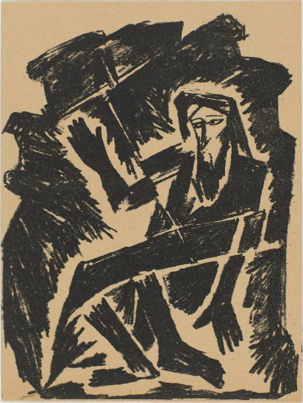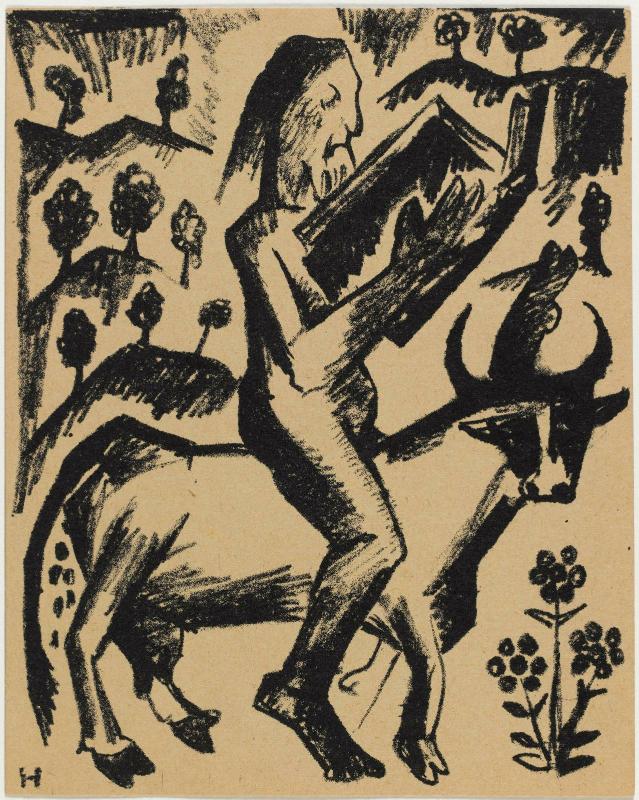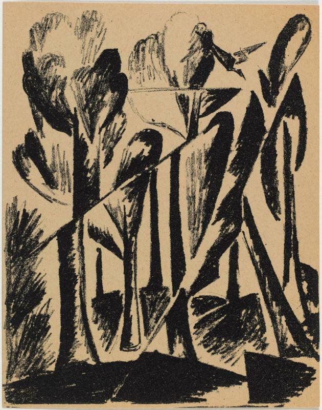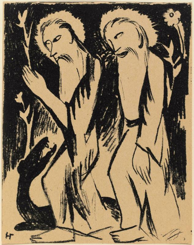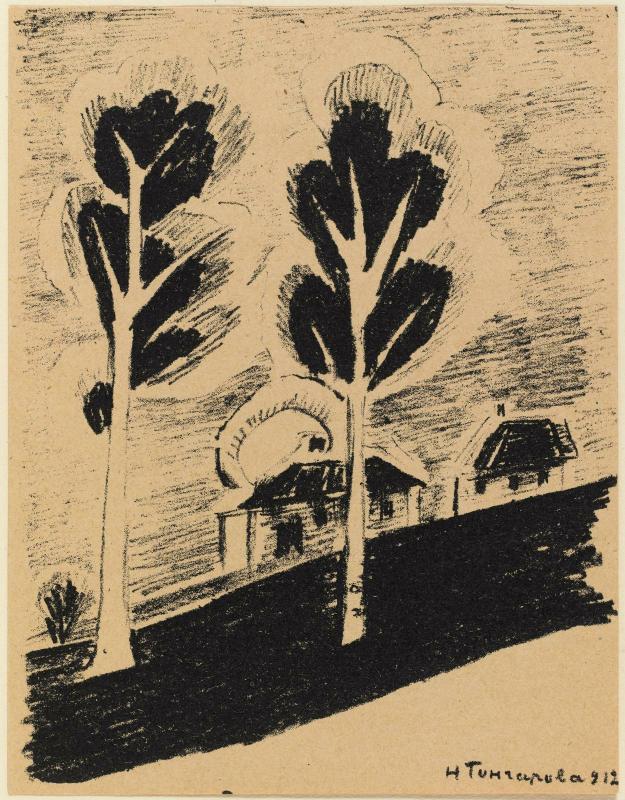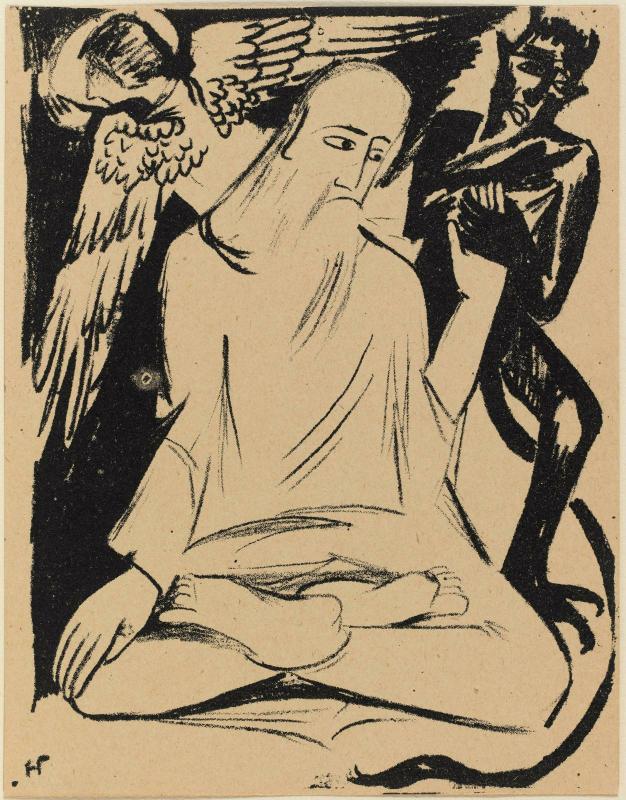 Gontcharova collabore avec le poète russe futuriste Alexeï Kroutchenykh pour l’un de ses romans épiques édité en 1913. Cette lithographie fait partie d’un ensemble de 9 illustrations, tirées à part, sans texte, et provient de l’ancienne collection de Guillaume Apollinaire. Les deux poèmes qui composent Poustynniki [Les Ermites] décrivent de manière subversive la vie des saints tiraillés entre ascèse et tentations. Gontcharova réalise une série de quinze gravures allégoriques et mystiques pour accompagner le texte (la couverture est de Larionov). L’artiste puise librement son inspiration dans le répertoire des icônes byzantines et de l’art folklorique russe.