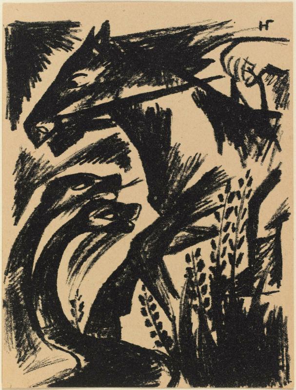 Dessinées, d’un trait vigoureux et épais, deux figures féminines, l’une de face, l’autre de profil, sont saisies par le rythme d’une danse. Leurs corps occupent tout l’espace. Le jeu des noirs et des blancs, des vides et des pleins, l’imbrication des jambes, créent un effet fortement contrasté. De même que les textes associés sont expérimentaux parfois phonétiques, évoquant dit-on, des chants paysans, le dessin n’illustre pas les propos écrits mais se veut un élément poétique complémentaire et à part entière. La force graphique de la ligne et des contrastes témoigne de la pleine maîtrise du procédé lithographique. Le travail de Gontcharova salué par Apollinaire lors de l’exposition à la galerie Paul Guillaume en 1914 s’inscrit dans une dynamique de recherche et d’expérimentation où le livre illustré devient un véritable laboratoire d’idées et de formes.