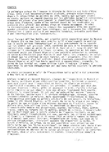 Lorsque William Rubin, qui organisa cette exposition pour le Museum of Modern Art de New York nous précisa qu’il n’envisageait de montrer que la seule période « métaphysique » et plus précisément de ne couvrir que les années qui précèdent 1919 – année où l’artiste abandonne la peinture métaphysique pour déclarer « Pictor classicus sum » –, conforme en cela à la tradition des surréalistes […], la question me fut immédiatement posée par Gérard Régnier d’une possible extension du contenu de cette manifestation pour Munich et pour Paris. […]