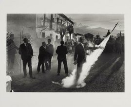 En la imagen se ve un antebrazo tendido. La noche anterior, los tanques del Ejército Rojo habían entrado en Praga. El rumor sobre una manifestación de protesta se había extendido rápidamente por la ciudad. La concentración debía producirse al final de la tarde en la plaza Venceslas. Pero se trataba de una trampa fomentada por varios agentes pagados por Moscú para provocar un incidente que justificara la invasión. Por suerte, el pueblo de Praga fue advertido a tiempo. A la hora anunciada, la plaza estaba casi desierta, como muestra la fotografía. Esta imagen es la primera de Exils, la serie que Josef Koudelka concibe en los años 1970 y 1980. Poco tiempo después de fotografiar la invasión de Praga por los soviéticos, la protesta y la represión, Koudelka decide irse de su país. En los meses de invierno, vive en Londres, luego en París. El resto del tiempo lo pasa viajando por las carreteras de Europa, en busca de la casualidad. Durante este periodo realiza algunas de las imágenes más asombrosas que componen Exils. Se exponen en París en 1984, luego son recopiladas en 1988 en una obra que ya es una referencia para la bibliofilia fotográfica antes de ser retirada y posteriormente reeditada.