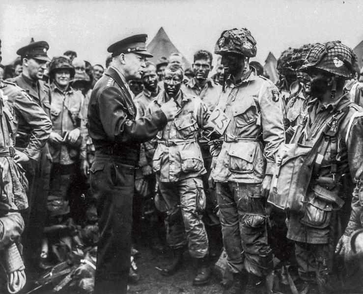 Le général D. Eisenhower rend visite aux troupes parachutistes de la 101e division aéroportée quelques heures avant leur largage sur la France occupée, 5 juin 1944