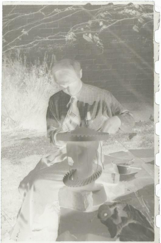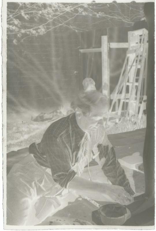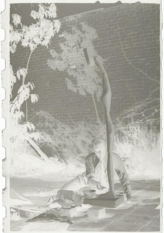 Max Ernst travaillant à la sculpture de plâtre Femme debout, Sedona,...
