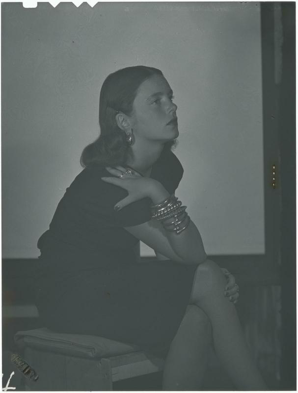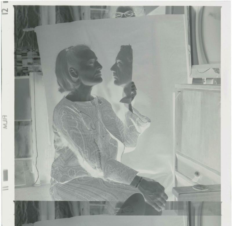 Jean Farley Levy tenant le moulage du visage de Man Ray, Juliet Man...