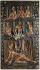 Pierre Bettencourt découvre la peinture avec Dubuffet, au début des années 1950, en chassant le papillon qu’il considère comme son « premier maître à peindre, car il est un modèle de métamorphose », écrit-il en 1971 (P. Bettencourt, Les Hauts-Reliefs de Pierre Bettencourt, Paris, Hachette, 1971, p. 9). Mais sa vocation première est la littérature : grand lecteur de Sade, il édite des textes de Paulhan, Artaud, et Michaux, ce dernier écrivant la préface de sa première exposition à la galerie Drouin en 1956. Ses voyages également, fort nombreux à partir de 1947, dans des pays de très ancienne culture (Afrique, Océanie), façonnent son imaginaire et lui apprennent – puisque de son propre aveu, il ne sait pas peindre à l’huile – à utiliser des matériaux exclusivement trouvés dans la nature. Ainsi ce haut-relief de La Voie lactée, composé de matériaux précaires (ardoise, coquilles d’œuf, tessons de terre cuite, fragments de miroir), qui fait partie de l’ensemble des vingt-trois hauts-reliefs présentés par la galerie Daniel Cordier en 1964 (six d’entre eux, réalisés entre 1957 et 1967, appartement au fonds DBC, donné en 1982, ou de la donation de 1989). L’œuvre s’ordonne à partir d’un cadre architectural qui est une sorte de façade géométrique, statique, aux couleurs métalliques. Elle se détache d’un fond, formé d’éclats de miroir peints en noir, composant une mosaïque d’étoiles, qui pourraient avoir donné son titre au relief. Constitués de toitures d’ardoises posées avec la minutie d’un couvreur, et soutenus par des colonnes, les murs de cette architecture servent, nous dit l’artiste, « surtout à défendre du ciel, à s’en isoler ». Enfermées dans cet édifice cloisonné, six femmes nues aux corps voluptueux et à l’expression torturée regardent ce dieu d’ardoise aux cheveux filasse, qui, tel un sacrificateur païen, poignarde une victime agenouillée sur un autel noir. Ses plumes de dieu Inca, taillées dans des éclats de miroir, se retrouveront dans le glaive énucléateur d’un autre assemblage de la donation, La Conversion de saint Paul (1956, AM 1989-237), associant également éros et thanatos. « Peinture impure. Chargée, obsédée, possédée », selon Michaux (préface au cat. exp., Paris, galerie René Drouin, 1956), cette scène traduit, une fois de plus, un des thèmes obsessionnels chers à Bettencourt, celui du sacrifice, dans sa dimension sadienne.