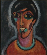 «En el rostro se puede ver el cosmos entero», declara el artista ruso Jawlensky. A partir de 1917, al introducir la abstracción, reinterpreta la tradición mística del color-luz de los iconos, vidrieras y manuscritos. En 1921, inicia la serie Têtes Abstraites tan solo a partir de formas geométricas: en este caso, el rostro en forma de «U», el peinado triangular, el arco de un círculo para el astro, y los ojos cerrados que ilustran una fuerte espiritualidad.