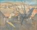 À partir de 1953, Balthus réside à Chassy, un château entouré de dépendances et de fermes, dans la Nièvre. Il y peint de nombreux paysages, notamment six vues prises de la fenêtre surplombant les deux cours de la ferme. Le tableau du Musée (cat. rais. no P 314) est le dernier de cette série (voir aussi Étude pour cour de ferme à Chassy, Colmar, Musée d’Unterlinden), l’ultime vue de Chassy peinte avant son départ pour Rome et la Villa Médicis, en 1961. Il y reprend, en l’élargissant, le cadrage d’une toile de 1954. Un froid soleil d’hiver baigne la moitié supérieure du tableau – la zone des champs, au-delà de l’enceinte – et pénètre en deux ou trois zébrures l’ombre de la cour. Un petit personnage vu de dos, en bas à gauche, à peine visible dans l’ombre, est la seule présence humaine dans cet ordonnancement géométrique d’une beauté abstraite. Balthus a en effet minutieusement agencé les lignes de construction : les volumes cubiques et les orthogonales des bâtiments, des portails et des piliers, contrastent avec les obliques croisées des parcelles cultivées sur la colline et avec le souple réseau des branches du grand arbre. Travail de recomposition qui transforme le portrait d’un lieu familier en un paysage « philosophique », au sens de Poussin ou de Piero Della Francesca. La peinture y a partie liée avec sa propre histoire, mais aussi avec le temps plus long des sédimentations géologiques, avec les cycles des saisons et des travaux qui leur sont associés depuis toujours.