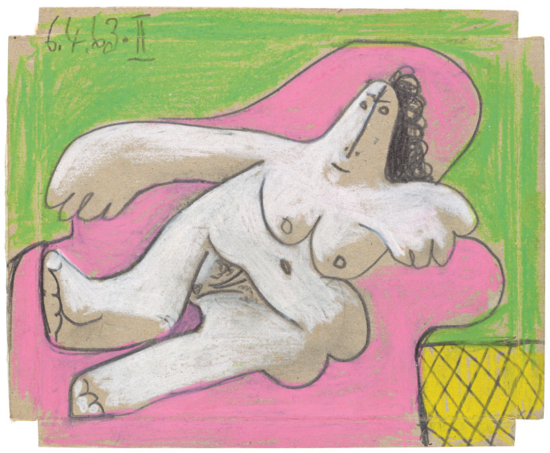 Sur une enveloppe décachetée, une page de journal, un papier d’emballage, un morceau de buvard, au dos d’un carton d’invitation, au verso d’un prospectus, au fond d’une boîte en carton, et même sur un torse découvert ou un genou nu… Le dessin se contente de peu, et s’agrège à tout. Si Picasso utilise parfois un très beau vergé (pour la série des Crucifixions de 1932, par exemple) ou de grandes feuilles de vélin (c’est le cas du cycle consacré au Minotaure en 1936), il fait feu de tout bois. Mais rien n’est anodin : par sa matérialité même, sa texture, sa découpe, sa couleur, le papier engage le devenir de l’œuvre. Les dessins réalisés sur des supports de récupération en offrent la démonstration, le trait venant se loger dans les marges d’un texte ou s’inscrire entre les plis d’une enveloppe.