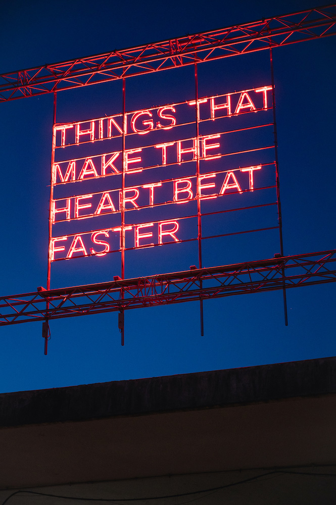 TE — Dans le cadre des premières scénographies de Forced Entertainment, en 1987 et en 1991. La première enseigne au néon que j'ai réalisée pour un autre contexte, c'était pour l'exposition d'art Art Sheffield 08, en 2008. J'étais enthousiasmé par l’idée que l'œuvre soit dans l'espace public, en dialogue avec la ville. Chaque fois qu'une œuvre est réalisée pour un nouveau lieu, ou qu'une œuvre existante est installée dans un nouvel emplacement, il y a toujours une sorte de conversation avec l'environnement qui l’entoure. Les œuvres dans l'espace urbain ont aussi une temporalité intéressante, les gens les croisent à différents moments de la journée, à différents moments de leur routine quotidienne. Et parfois, ils passent devant plusieurs fois, en l’espace de plusieurs semaines ou de plusieurs mois. J'aime la façon dont, dans ces circonstances, les œuvres entrent dans l'expérience quotidienne des gens. Une phrase utilisée dans une œuvre peut être frappante ou inspirante, puis se fondre dans le paysage, pour être à nouveau remarquée plus tard... Dans cette situation, le texte a la chance de résonner de différentes manières, selon les différentes humeurs et énergies de la ville et de la météo.