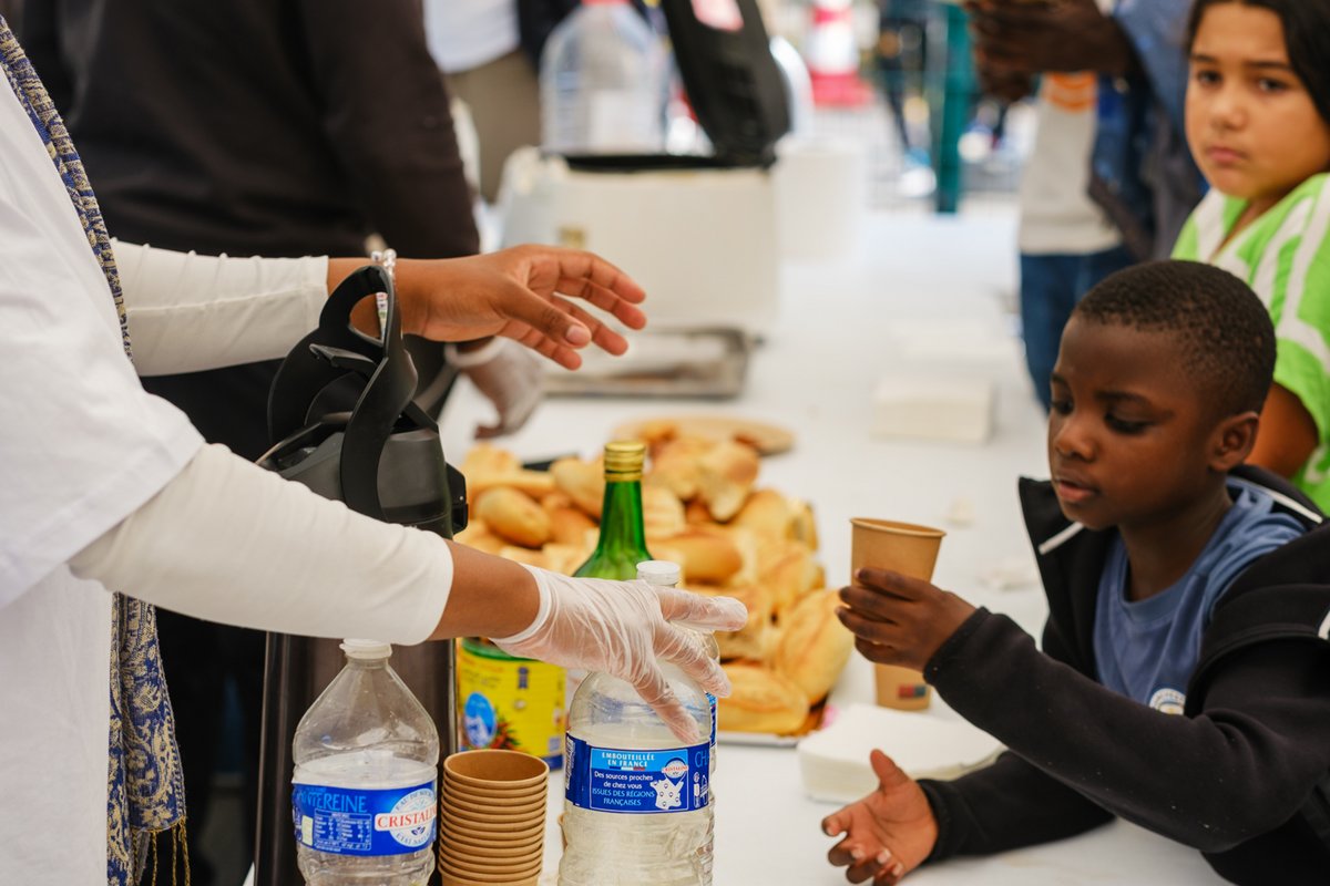 Ce samedi 21 septembre 2024, c’est à une célébration critique des vingt ans du musée précaire Albinet qu’invite Thomas Hirschhorn. L’espace-œuvre, que délimitent les côtés du terrain de sport, est entièrement aménagé par ses soins, selon l’économie radicale de la précarité chère à ses yeux. Au centre, la maquette du musée précaire d’il y a deux décennies (entrée récemment dans la collection du Centre Pompidou). Dans le coin sud-ouest, un espace de projection et de diffusion de films d’archive fait de cartons, de sacs poubelles noirs, de divers écrans. Sur le côté nord, de grandes tables recouvertes de plats généreux, concoctés et servis par des habitant·es ; merguez, brochettes, couscous, boissons chaudes et fraîches… à volonté.