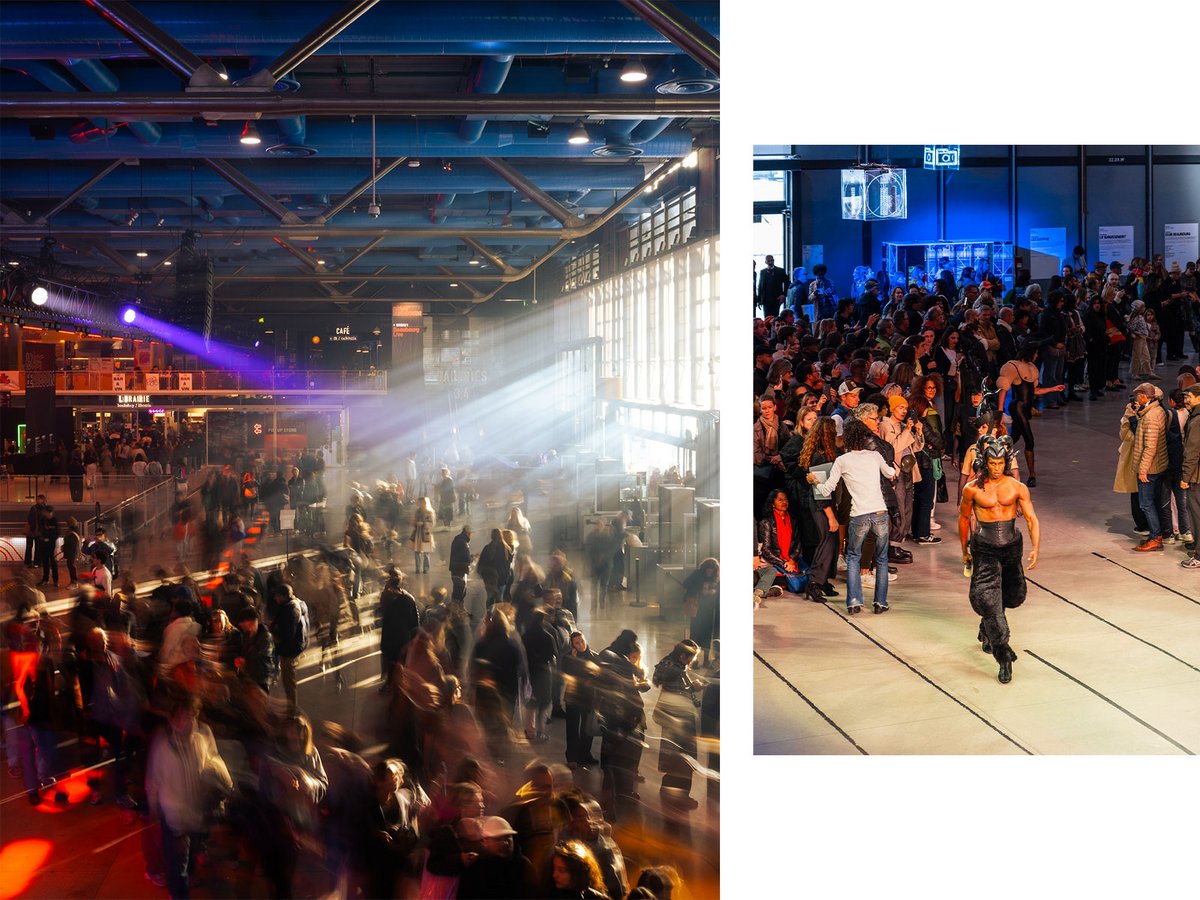 Le public emplit le bâtiment jusqu’à ses moindres recoins ; toustes veulent vivre un dernier instant à Beaubourg. Les plus nostalgiques versent une larme, des voix vacillent sous le coup de l'émotion. On boit un verre ou mange un morceau à l’un des nombreux stands, on s’attarde sur la lumière rasante et la vue sur Paris, on discute de tout, de rien, chacun·e évoque son lien personnel avec le lieu, tandis que dans les anciennes Galeries 3 et 4, au niveau 1, réunies pour l’occasion, se produisent des artistes de tous les horizons ; Catherine Ringer, Christine and the Queens, Keziah Jones… mais aussi Aya Nakamura faisant une apparition surprise auprès de son protégé RnBoi face à un public d’adolescent·es déchaîné·es, reprenant à l’unisson les tubes de leur idole. Qu’un influenceur connu passe incidemment, et c’est la ruée — on lui court après, on veut un selfie, un TikTok. Fausse alerte, c’était un·e autre, qu’on aura confondu·e. Aussitôt voici la foule repartie dans l’autre sens, en direction du Forum, toujours en délire.