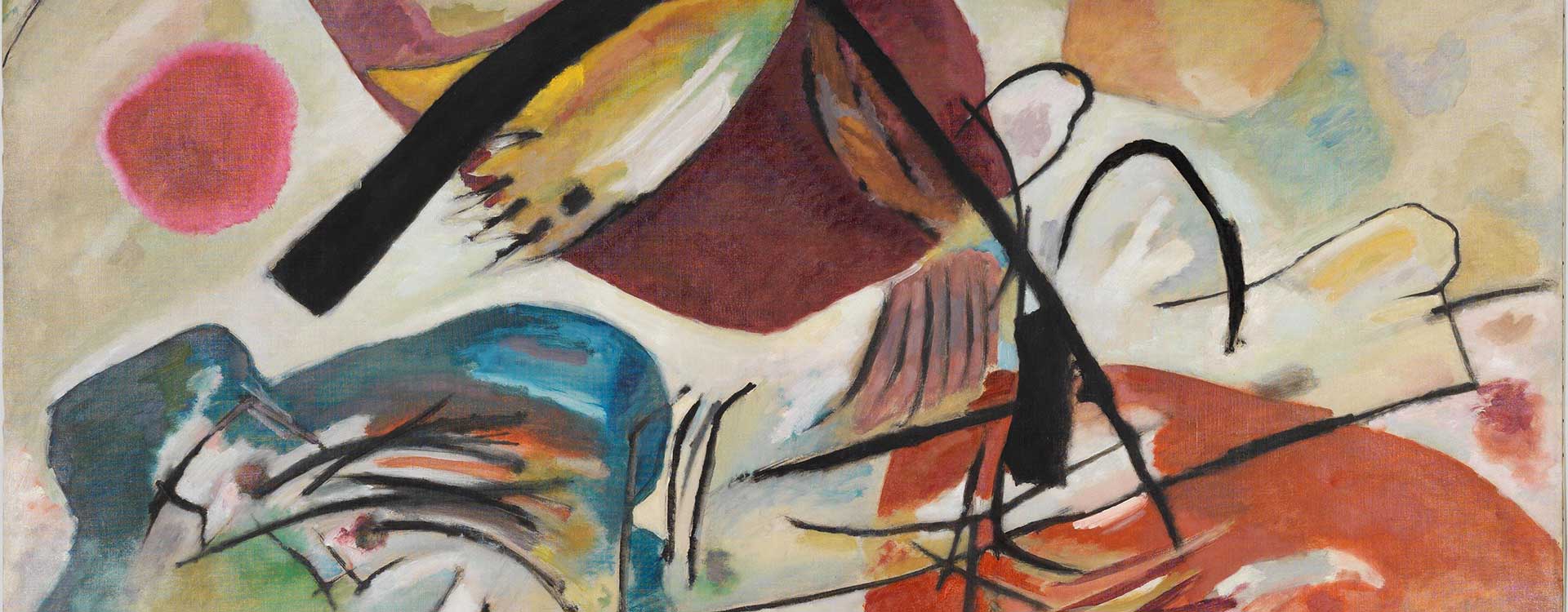 Juste avant l’ouverture de son exposition à la galerie der Sturm à Berlin en septembre 1912, Wassily Kandinsky (1866–1944) demande de remplacer une petite peinture par une autre, de format presque carré beaucoup plus grande, intitulée Mit dem schwarzen Bogen (« Avec l’arc noir »). Dans cette grande composition qu’il vient juste de terminer, trois blocs de couleurs, rouge, bleu et violet-bordeaux, semblent entrer en collision. Un épais arc noir les enjambe. Du mouvement se dégage, vivifié par de nombreux traits noirs qui viennent traverser, relier ou entailler les couleurs. Avec l’arc noir est le fruit d’une intense période de recherche au cours de laquelle Kandinsky poursuit toujours le même but : rendre visible l’expression de son sentiment intérieur et trouver la forme artistique propre à susciter une puissance d’émotion proche de l’extase.