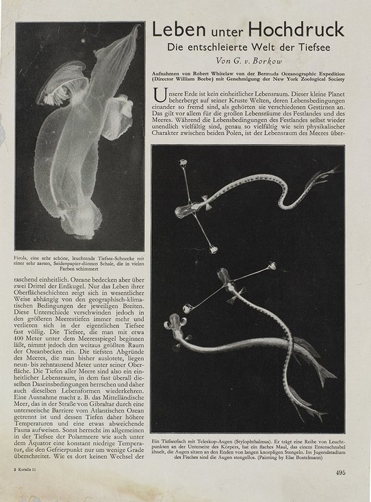 Ainsi, dans ses dernières années parisiennes (1933-1944), Kandinsky feuillette avec un intérêt renouvelé les images de son encyclopédie Die Kultur der Gegenwart (« La culture du temps présent ») — auxquelles il renvoyait déjà en 1926 dans son essai Point et ligne sur plan — pour nourrir son vocabulaire biomorphique. Il ne reproduit jamais les schémas anatomiques d’insectes ou d’animaux, ni ceux qui présentent les processus de division cellulaire, mais ses œuvres s’inspirent certainement de ces dessins simplifiés de la diversité du vivant. Dans Entassement réglé (1938), une membrane semble ainsi envelopper des embryons d’organismes imaginaires entourés d’une myriade de points qui rappellent les œufs ou les graines. Dans Point et ligne sur plan (1926), Kandinsky écrivait déjà :