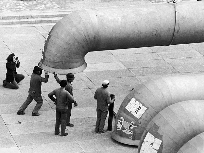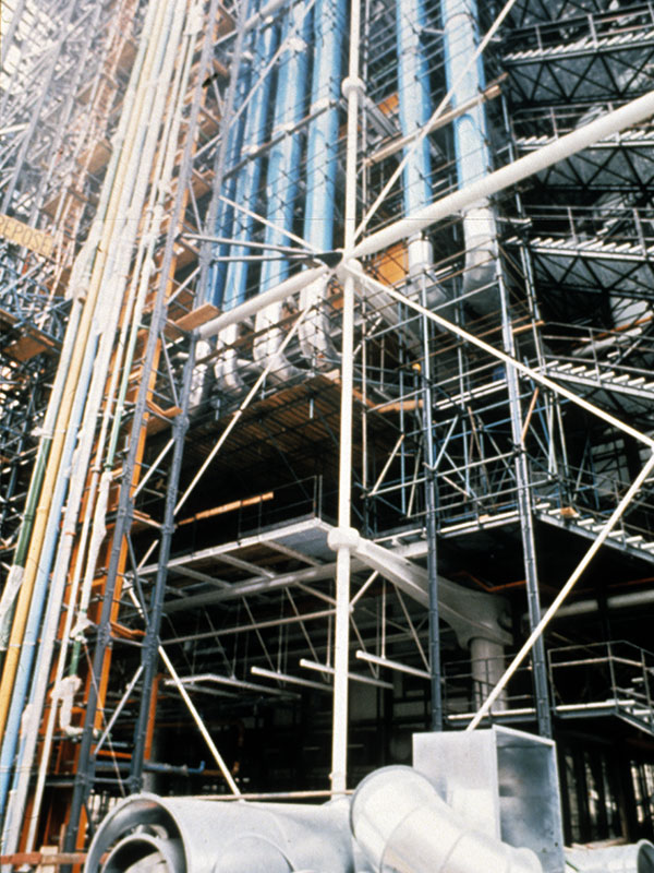 Richard Rogers et Renzo Piano, les jeunes architectes du Centre Pompidou, jouent les trouble-fête. Et pourtant… Le rejet des fluides et des circulations en périphérie du bâtiment répond tout d’abord à un objectif fonctionnel : gagner un maximum d’espace à l’intérieur. C’est ainsi que Beaubourg possède six grands plateaux libres, de six mille m2 chacun, au-dessus de la Piazza.