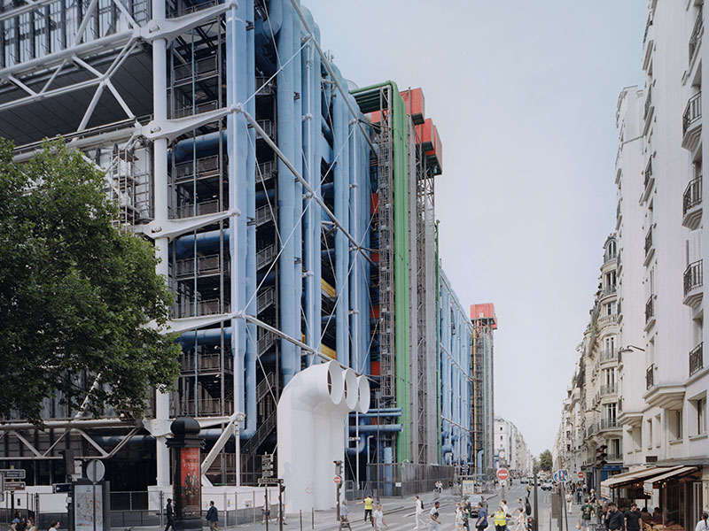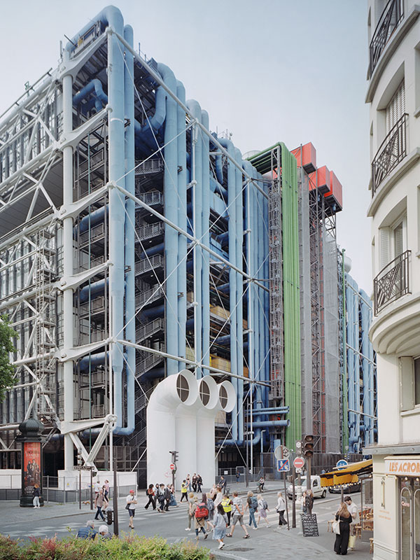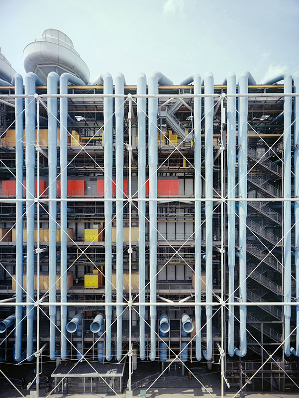 Mais revenons à nos tuyaux pompidoliens. Leur enchevêtrement n’a rien de la « cosmopompe » des Shadoks (célèbre série télévisée d’animation diffusée pendant la mandature de Georges Pompidou, 1969–1974). Au contraire, les choses sont très bien rangées. La fonction de chaque tuyau est déterminée par une couleur : bleu pour l’aération, vert pour l’eau, jaune pour l’électricité, blanc pour les tours de refroidissement, rouge pour les circulations des œuvres, des personnes et les pompes à incendie.
