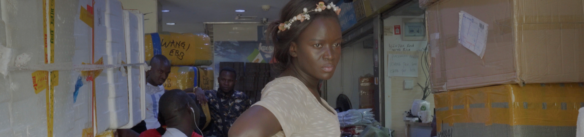 Filmé à Guangzhou, Na China est une enquête de terrain dans l'un des nouveaux centres du commerce globalisé où se font face l'Afrique et la Chine. Face à la mainmise économique chinoise en Afrique, une communauté africaine s’est installée à la source de ce marché pour y prendre part en court-circuitant la route de l’Occident. Marie Voignier s’intéresse en particulier aux trajectoires personnelles de négociantes africaines, dont l’activité déjoue les stéréotypes de genre et contribue à redéfinir le rôle des femmes dans l’économie mondialisée. Face à la difficulté de filmer des transactions qui se veulent discrètes, l’artiste adopte dans certaines scènes une méthode particulière passant par l'emploi d'actrices et d'acteurs dans une forme qui a toute l'apparence d'un documentaire. La dimension humaine des échanges, de mains à mains, entre en tension avec le système dématérialisé dans lequel ils s’inscrivent. Filmé avec des dispositifs discrets – téléphone portable, appareil photo, petite caméra – Na China fait affleurer une extraordinaire densité visuelle. Les espaces ont une présence critique, entièrement saturés par les objets d'une continuelle négociation : rayonnages, penderies, étals, sacs et piles de marchandises deviennent des personnages à part entière, les nouveaux fétiches autour desquels tourne de manière vertigineuse et anarchique le ressort spéculatif de la mondialisation. En ce sens, l'œuvre est aussi un essai visuel qui laisse flotter toute idée définitive de la valeur : économique, juridique, esthétique, éthique.