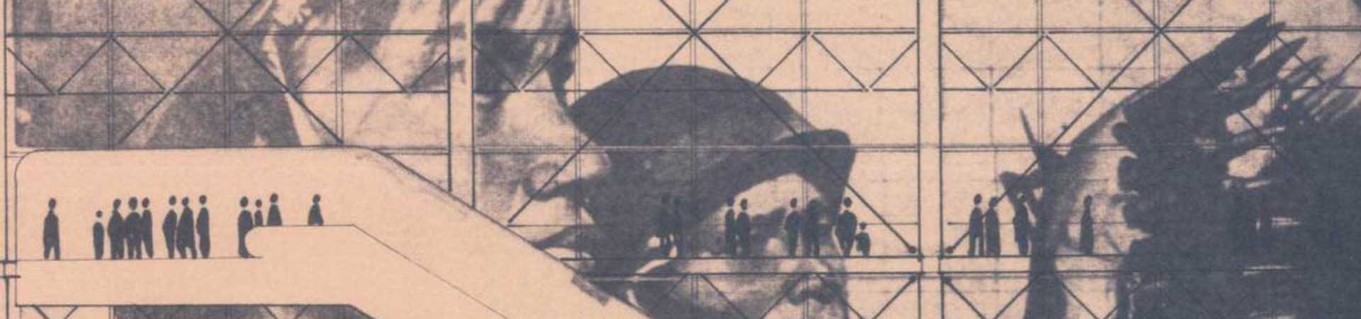 Renzo Piano, Richard Rogers, Gianfranco Franchini et Ove Arup & Partners, projet de concours pour la réalisation du Centre Beaubourg, juin 1971, detail de panneau audiovisuel en façade montrant les etudiant-e-s en revolte en mai 1968 et deux femmes soldates vietcong