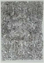 Comment le dessin peut-il apparaître, résister, se fondre, sur, sous et avec ces données particulières au support ? Le style très personnel des dessins de Rouan se caractérise par l’emploi systématique de hachures, points ou virgules, autant de signes d’une écriture illisible qui, par la discontinuité et la répétition, donnent une apparence tremblée, hésitante, aux figures créées.