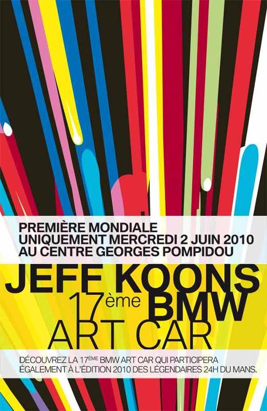 La BMW Art Car de Jeff Koons sera dévoilée pour la première fois au public le 2 juin au Centre Pompidou à Paris en présence de Jeff Koons et Alain Seban, Président du Centre Pompidou.