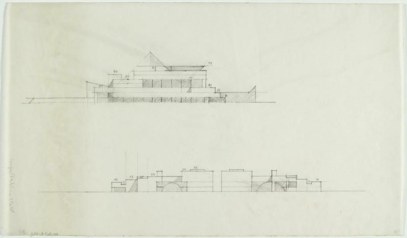 Plan et coupe du rez-de-chaussée, 1er et 2ème étages, esquisses,