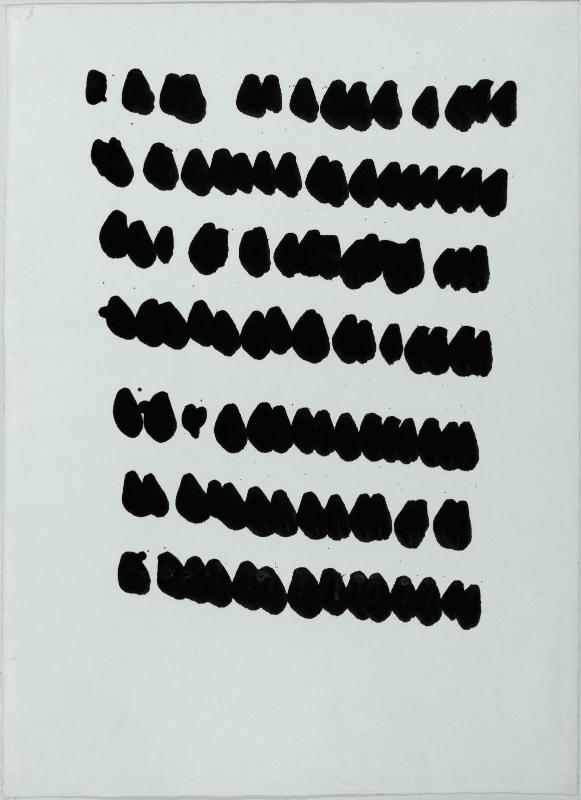 Après un bref passage à l’école des Beaux-Arts de Paris et quelques années où elle pratique la peinture à l’huile, Pierrette Bloch entreprend au début des années 1950 une série de grands collages abstraits qui se distinguent par leur sobriété et leur force monumentale. Son œuvre sera dès lors tout entière fondée sur une très précise économie de moyens : le papier et l’encre, le fil de crin, des formes élémentaires, l’absence de couleur, le geste répété et ses variantes. À partir de quelques principes créatifs très simples, tels l’énumération, l’écoulement de l’encre, les boucles et les nœuds des fils de crin (sur lesquels elle a travaillé à partir des années 1980, parallèlement aux dessins), elle explore un espace toujours en mouvement, insaisissable d’un seul coup d’œil. Son œuvre, totalement personnelle, ne peut être rattachée ni au Minimal Art ni à Supports-Surfaces, étant exempte en effet de toute théorie préalable, induisant plutôt des doutes, des questions. Elle aurait des affinités avec celle de Michel Parmentier, qui était un de ses proches. Dans Sans titre (1974), la composition est réduite au minimum : une succession de taches ovoïdes, toutes réalisées avec le même pinceau chinois (l’artiste en a d’innombrables, qu’elle choisit selon ses humeurs), et alignées en rangées plus ou moins régulières pour laisser entrevoir des interstices, des vides. Aucune logique, aucune intention particulière ne conduisent la main, mais un ordre souple : seuls diffèrent le tempo, le rythme, ici plutôt vif. Certains dessins, réalisés avec d’autres pinceaux, apparaîtront plus denses, plus tenus, parfois presque dramatiques (bien que ce mot ne fasse pas partie du vocabulaire de l’artiste) ; d’autres encore sembleront jaillir d’une seule envolée du pinceau. Tout dépend du moment : Pierrette Bloch travaille vite et jette beaucoup. Autant que la dimension de l’espace, la dimension du temps est primordiale chez elle.