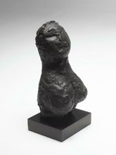 Ces variations, faites selon le peintre pour être posées sur un meuble plutôt que d’être accrochées au mur, dérangent. Elles évoquent la production ou la reproduction que Fautrier et sa compagne, Jeanne Aeply, allaient exploiter sous la dénomination d’« originaux multiples ». Le procédé déstabilise une fois de plus le monde des collectionneurs de Fautrier. De cette tête d’otage à la fougère d’yeux, Palma Bucarelli, dans son catalogue de l’œuvre de Fautrier, publie un autre exemplaire. Quant au sujet, il est ambigu comme le note Daniel Vallard dans Poésie , 1946 : « Fautrier ne regarde pas les otages avant ou pendant l’événement – [la fusillade] –, mais après, et semble-t-il, longtemps après, au moment où ces martyrs ensanglantés, profanés, déchirés, quittent cette forme humaine adorable et se décomposent » (cité in cat. exp. Paris, 1964, op. cit. , n.p.).
