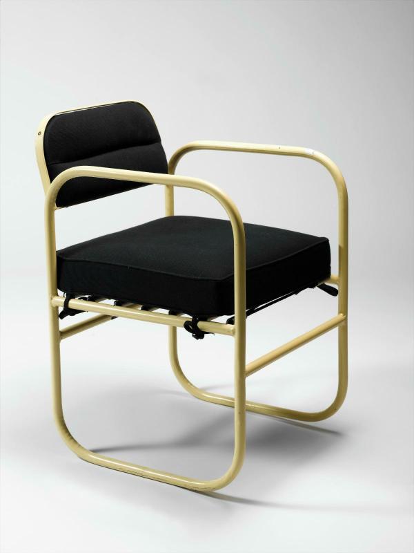 | Technique | Structure en métal tubulaire laqué ivoire. Dossier et assise recouverts d'une cotonnade noire |